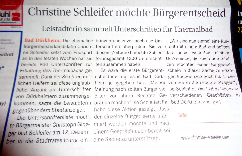 Artikel Stadtanzeiger, 23.11.2017 23. November 2017 von Christine Schleifer | Keine Kommentare Ähnliche Beiträge: Geplante Schließung – Thermalbad BAD Dürkheim Meine Rede zur Stadtratssitzung am 12.12.2017 zur Anhörung des Bürgerbegehrens zum Weiterbetrieb des Thermalbades Bericht im Stadtanzeiger Bad Dürkheim Leistadter Jahresauftakt 2017