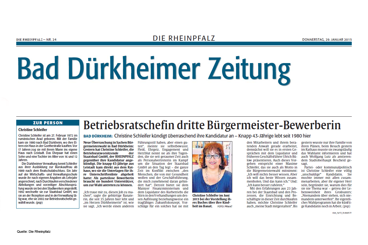 Wie in der Rheinpfalz-Bad Dürkheimer Zeitung vom 29.01.2015 in der Presse bereits gemeldet wurde, bewerbe ich mich für die am 28. Juni 2015 stattfindende Wahl als Ihre Bürgermeisterin. Ich lebe seit 35 Jahren in Bad Dürkheim und bin durch meine Ausbildung und meinen beruflichen Werdegang mit den Bürgern, den städtischen Einrichtungen und den Herausforderungen in Bad Dürkheim bestens vertraut.
